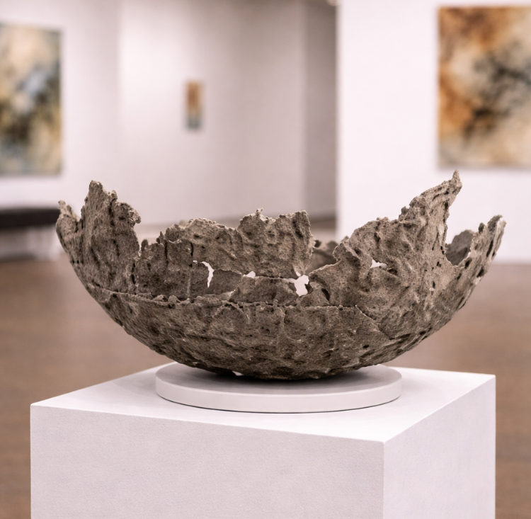 This sculptural work presents a fragile, bowl-like form with jagged, irregular edges that appear weathered and worn. Its rough, porous surface evokes natural processes such as erosion, decay, and transformation. The open structure, punctured with voids and gaps, suggests both loss and resilience—an object that has endured time yet remains standing. The neutral, earthy tones enhance its organic quality, making it feel as though it could have emerged from the ground or been shaped by environmental forces rather than human hands.