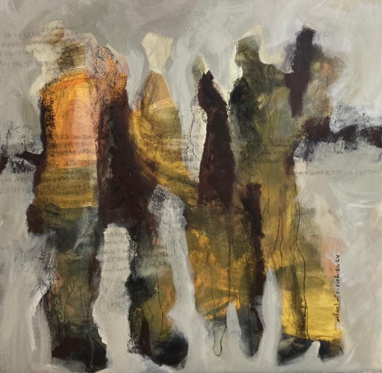 This painting from the “Human Echoes” series, 2024, called The Weight of the Unspoken, it has painted in Egypt, is a mixed-media composition that balances abstraction with hauntingly familiar human forms. The piece features a cluster of figures rendered in earthy ochres, deep umbers, and sudden bursts of warm gold, standing against a fractured, misty grey background.